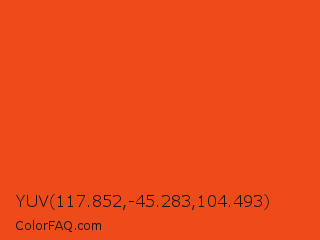 YUV 117.852,-45.283,104.493 Color is a normal red color and the nearest color is Pomegranate #f34723. Hex code #ed4b1a and RGB value is rgb(237,75,26). In RGB color space, this color is composed of 93% red, 29% green, 10% blue, In CMYK color space, this color is composed of 0% cyan, 68% magenta, 89% yellow , 7% black , In HSL color space, this color has a hue angle of 14° , 85% saturation and 52% lightness.