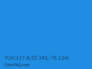 YUV 117.8,53.343,-76.124 Color is a normal blue color and the nearest color is Bleu De France #318ce7. Hex code #1f8de2 and RGB value is rgb(31,141,226). In RGB color space, this color is composed of 12% red, 55% green, 89% blue, In CMYK color space, this color is composed of 86% cyan, 38% magenta, 0% yellow , 11% black , In HSL color space, this color has a hue angle of 206° , 77% saturation and 50% lightness.