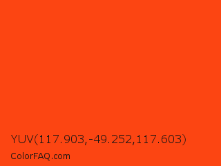 YUV 117.903,-49.252,117.603 Color is a normal red color and the nearest color is Orioles Orange #fb4f14. Hex code #fc4512 and RGB value is rgb(252,69,18). In RGB color space, this color is composed of 99% red, 27% green, 7% blue, In CMYK color space, this color is composed of 0% cyan, 73% magenta, 93% yellow , 1% black , In HSL color space, this color has a hue angle of 13° , 98% saturation and 53% lightness.
