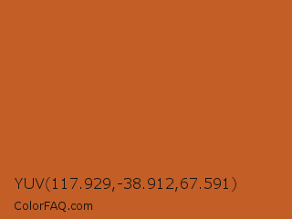 YUV 117.929,-38.912,67.591 Color is a normal orange color and the nearest color is Piper #c96323. Hex code #c35e27 and RGB value is rgb(195,94,39). In RGB color space, this color is composed of 76% red, 37% green, 15% blue, In CMYK color space, this color is composed of 0% cyan, 52% magenta, 80% yellow , 24% black , In HSL color space, this color has a hue angle of 21° , 67% saturation and 46% lightness.