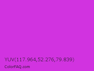 YUV 117.964,52.276,79.839 Color is a normal magenta color and the nearest color is Steel Pink #cc33cc. Hex code #d133e0 and RGB value is rgb(209,51,224). In RGB color space, this color is composed of 82% red, 20% green, 88% blue, In CMYK color space, this color is composed of 7% cyan, 77% magenta, 0% yellow , 12% black , In HSL color space, this color has a hue angle of 295° , 74% saturation and 54% lightness.