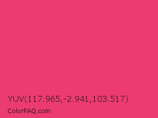 YUV 117.965,-2.941,103.517 Color is a normal rose color and the nearest color is Paradise Pink #e63e62. Hex code #ec3b70 and RGB value is rgb(236,59,112). In RGB color space, this color is composed of 93% red, 23% green, 44% blue, In CMYK color space, this color is composed of 0% cyan, 75% magenta, 53% yellow , 7% black , In HSL color space, this color has a hue angle of 342° , 82% saturation and 58% lightness.