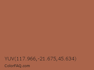 YUV 117.966,-21.675,45.634 Color is a normal orange color and the nearest color is Cape Palliser #a26645. Hex code #aa644a and RGB value is rgb(170,100,74). In RGB color space, this color is composed of 67% red, 39% green, 29% blue, In CMYK color space, this color is composed of 0% cyan, 41% magenta, 56% yellow , 33% black , In HSL color space, this color has a hue angle of 16° , 39% saturation and 48% lightness.