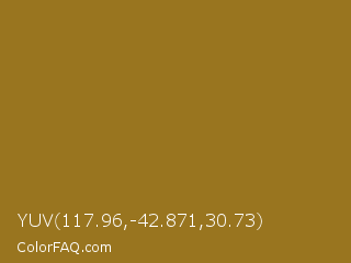 YUV 117.96,-42.871,30.73 Color is a normal orange color and the nearest color is Sand Dune #967117. Hex code #99751f and RGB value is rgb(153,117,31). In RGB color space, this color is composed of 60% red, 46% green, 12% blue, In CMYK color space, this color is composed of 0% cyan, 24% magenta, 80% yellow , 40% black , In HSL color space, this color has a hue angle of 42° , 66% saturation and 36% lightness.