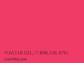 YUV 118.021,-7.898,106.976 Color is a normal red color and the nearest color is Paradise Pink #e63e62. Hex code #f03b66 and RGB value is rgb(240,59,102). In RGB color space, this color is composed of 94% red, 23% green, 40% blue, In CMYK color space, this color is composed of 0% cyan, 75% magenta, 58% yellow , 6% black , In HSL color space, this color has a hue angle of 346° , 86% saturation and 59% lightness.