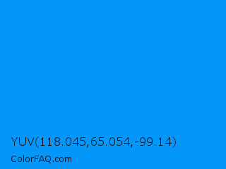 YUV 118.045,65.054,-99.14 Color is a normal blue color and the nearest color is Vivid Cerulean #00aaee. Hex code #0596fa and RGB value is rgb(5,150,250). In RGB color space, this color is composed of 2% red, 59% green, 98% blue, In CMYK color space, this color is composed of 98% cyan, 40% magenta, 0% yellow , 2% black , In HSL color space, this color has a hue angle of 204° , 96% saturation and 50% lightness.