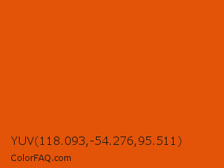 YUV 118.093,-54.276,95.511 Color is a normal orange color and the nearest color is Trinidad #e64e03. Hex code #e35408 and RGB value is rgb(227,84,8). In RGB color space, this color is composed of 89% red, 33% green, 3% blue, In CMYK color space, this color is composed of 0% cyan, 63% magenta, 96% yellow , 11% black , In HSL color space, this color has a hue angle of 21° , 93% saturation and 46% lightness.