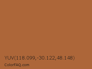 YUV 118.099,-30.122,48.148 Color is a normal orange color and the nearest color is Brown Rust #af593e. Hex code #ad6639 and RGB value is rgb(173,102,57). In RGB color space, this color is composed of 68% red, 40% green, 22% blue, In CMYK color space, this color is composed of 0% cyan, 41% magenta, 67% yellow , 32% black , In HSL color space, this color has a hue angle of 23° , 50% saturation and 45% lightness.