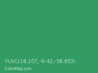 YUV 118.107,-9.42,-58.853 Color is a normal green color and the nearest color is Chateau Green #40a860. Hex code #339c63 and RGB value is rgb(51,156,99). In RGB color space, this color is composed of 20% red, 61% green, 39% blue, In CMYK color space, this color is composed of 67% cyan, 0% magenta, 37% yellow , 39% black , In HSL color space, this color has a hue angle of 147° , 51% saturation and 41% lightness.