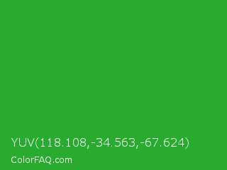 YUV 118.108,-34.563,-67.624 Color is a normal green color and the nearest color is Wageningen Green #34b233. Hex code #29ab30 and RGB value is rgb(41,171,48). In RGB color space, this color is composed of 16% red, 67% green, 19% blue, In CMYK color space, this color is composed of 76% cyan, 0% magenta, 72% yellow , 33% black , In HSL color space, this color has a hue angle of 123° , 61% saturation and 42% lightness.