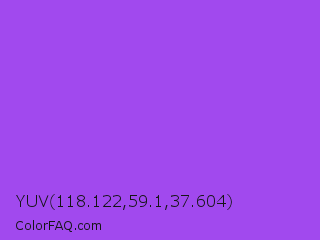 YUV 118.122,59.1,37.604 Color is a light purple color and the nearest color is Navy Purple #9457eb. Hex code #a149ee and RGB value is rgb(161,73,238). In RGB color space, this color is composed of 63% red, 29% green, 93% blue, In CMYK color space, this color is composed of 32% cyan, 69% magenta, 0% yellow , 7% black , In HSL color space, this color has a hue angle of 272° , 83% saturation and 61% lightness.