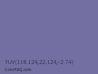 YUV 118.124,22.124,-2.74 Color is a normal indigo color and the nearest color is Kimberly #736c9f. Hex code #736fa3 and RGB value is rgb(115,111,163). In RGB color space, this color is composed of 45% red, 44% green, 64% blue, In CMYK color space, this color is composed of 29% cyan, 32% magenta, 0% yellow , 36% black , In HSL color space, this color has a hue angle of 245° , 22% saturation and 54% lightness.