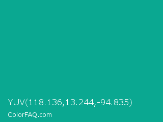 YUV 118.136,13.244,-94.835 Color is a normal cyan color and the nearest color is Persian Green #00a693. Hex code #0aa891 and RGB value is rgb(10,168,145). In RGB color space, this color is composed of 4% red, 66% green, 57% blue, In CMYK color space, this color is composed of 94% cyan, 0% magenta, 14% yellow , 34% black , In HSL color space, this color has a hue angle of 171° , 89% saturation and 35% lightness.