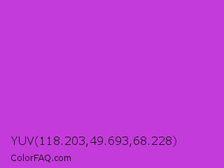 YUV 118.203,49.693,68.228 Color is a normal purple color and the nearest color is Steel Pink #cc33cc. Hex code #c43bdb and RGB value is rgb(196,59,219). In RGB color space, this color is composed of 77% red, 23% green, 86% blue, In CMYK color space, this color is composed of 11% cyan, 73% magenta, 0% yellow , 14% black , In HSL color space, this color has a hue angle of 291° , 69% saturation and 55% lightness.
