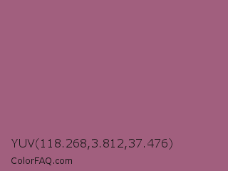 YUV 118.268,3.812,37.476 Color is a normal rose color and the nearest color is Tapestry #b05e81. Hex code #a15f7e and RGB value is rgb(161,95,126). In RGB color space, this color is composed of 63% red, 37% green, 49% blue, In CMYK color space, this color is composed of 0% cyan, 41% magenta, 22% yellow , 37% black , In HSL color space, this color has a hue angle of 332° , 26% saturation and 50% lightness.