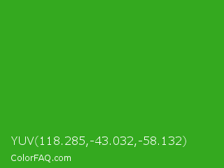 YUV 118.285,-43.032,-58.132 Color is a normal green color and the nearest color is Wageningen Green #34b233. Hex code #34a91f and RGB value is rgb(52,169,31). In RGB color space, this color is composed of 20% red, 66% green, 12% blue, In CMYK color space, this color is composed of 69% cyan, 0% magenta, 82% yellow , 34% black , In HSL color space, this color has a hue angle of 111° , 69% saturation and 39% lightness.