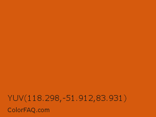 YUV 118.298,-51.912,83.931 Color is a normal orange color and the nearest color is Red Stage #d05f04. Hex code #d65a0d and RGB value is rgb(214,90,13). In RGB color space, this color is composed of 84% red, 35% green, 5% blue, In CMYK color space, this color is composed of 0% cyan, 58% magenta, 94% yellow , 16% black , In HSL color space, this color has a hue angle of 23° , 89% saturation and 45% lightness.