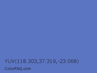 YUV 118.303,37.319,-23.068 Color is a normal blue color and the nearest color is Glaucous #6082b6. Hex code #5c75c2 and RGB value is rgb(92,117,194). In RGB color space, this color is composed of 36% red, 46% green, 76% blue, In CMYK color space, this color is composed of 53% cyan, 40% magenta, 0% yellow , 24% black , In HSL color space, this color has a hue angle of 225° , 46% saturation and 56% lightness.