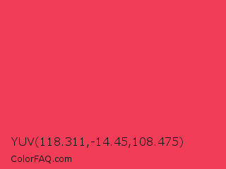 YUV 118.311,-14.45,108.475 Color is a normal red color and the nearest color is Desire #ea3c53. Hex code #f23d59 and RGB value is rgb(242,61,89). In RGB color space, this color is composed of 95% red, 24% green, 35% blue, In CMYK color space, this color is composed of 0% cyan, 75% magenta, 63% yellow , 5% black , In HSL color space, this color has a hue angle of 351° , 87% saturation and 59% lightness.