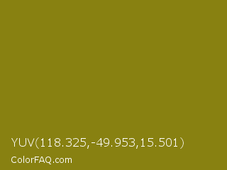 YUV 118.325,-49.953,15.501 Color is a dark yellow color and the nearest color is Trendy Green #7c881a. Hex code #888111 and RGB value is rgb(136,129,17). In RGB color space, this color is composed of 53% red, 51% green, 7% blue, In CMYK color space, this color is composed of 0% cyan, 5% magenta, 88% yellow , 47% black , In HSL color space, this color has a hue angle of 56° , 78% saturation and 30% lightness.
