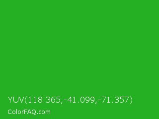YUV 118.365,-41.099,-71.357 Color is a normal green color and the nearest color is Wageningen Green #34b233. Hex code #25b023 and RGB value is rgb(37,176,35). In RGB color space, this color is composed of 15% red, 69% green, 14% blue, In CMYK color space, this color is composed of 79% cyan, 0% magenta, 80% yellow , 31% black , In HSL color space, this color has a hue angle of 119° , 67% saturation and 41% lightness.