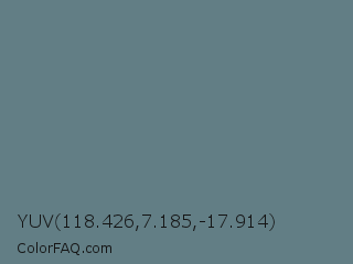 YUV 118.426,7.185,-17.914 Color is a normal cyan color and the nearest color is Aurometalsaurus #6e7f80. Hex code #627e85 and RGB value is rgb(98,126,133). In RGB color space, this color is composed of 38% red, 49% green, 52% blue, In CMYK color space, this color is composed of 26% cyan, 5% magenta, 0% yellow , 48% black , In HSL color space, this color has a hue angle of 192° , 15% saturation and 45% lightness.