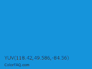 YUV 118.42,49.586,-84.56 Color is a normal blue color and the nearest color is Rich Electric Blue #0892d0. Hex code #1694db and RGB value is rgb(22,148,219). In RGB color space, this color is composed of 9% red, 58% green, 86% blue, In CMYK color space, this color is composed of 90% cyan, 32% magenta, 0% yellow , 14% black , In HSL color space, this color has a hue angle of 202° , 82% saturation and 47% lightness.