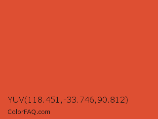 YUV 118.451,-33.746,90.812 Color is a normal red color and the nearest color is Punch #dc4333. Hex code #de4f32 and RGB value is rgb(222,79,50). In RGB color space, this color is composed of 87% red, 31% green, 20% blue, In CMYK color space, this color is composed of 0% cyan, 64% magenta, 77% yellow , 13% black , In HSL color space, this color has a hue angle of 10° , 72% saturation and 53% lightness.