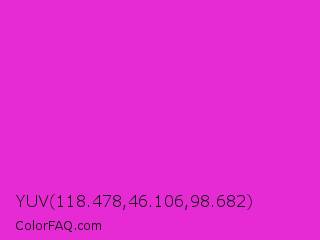 YUV 118.478,46.106,98.682 Color is a normal magenta color and the nearest color is Razzle Dazzle Rose #ff33cc. Hex code #e72bd4 and RGB value is rgb(231,43,212). In RGB color space, this color is composed of 91% red, 17% green, 83% blue, In CMYK color space, this color is composed of 0% cyan, 81% magenta, 8% yellow , 9% black , In HSL color space, this color has a hue angle of 306° , 80% saturation and 54% lightness.