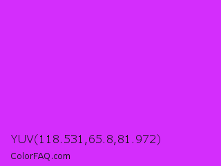 YUV 118.531,65.8,81.972 Color is a normal purple color and the nearest color is Vivid Orchid #cc00ff. Hex code #d42dfc and RGB value is rgb(212,45,252). In RGB color space, this color is composed of 83% red, 18% green, 99% blue, In CMYK color space, this color is composed of 16% cyan, 82% magenta, 0% yellow , 1% black , In HSL color space, this color has a hue angle of 288° , 97% saturation and 58% lightness.