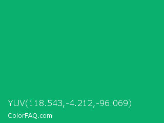 YUV 118.543,-4.212,-96.069 Color is a normal green color and the nearest color is Jade #00a86b. Hex code #09b06e and RGB value is rgb(9,176,110). In RGB color space, this color is composed of 4% red, 69% green, 43% blue, In CMYK color space, this color is composed of 95% cyan, 0% magenta, 38% yellow , 31% black , In HSL color space, this color has a hue angle of 156° , 90% saturation and 36% lightness.