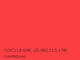 YUV 118.668,-25.965,115.178 Color is a light red color and the nearest color is Coral Red #ff4040. Hex code #fa3e42 and RGB value is rgb(250,62,66). In RGB color space, this color is composed of 98% red, 24% green, 26% blue, In CMYK color space, this color is composed of 0% cyan, 75% magenta, 74% yellow , 2% black , In HSL color space, this color has a hue angle of 359° , 95% saturation and 61% lightness.