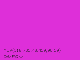 YUV 118.705,48.459,90.59 Color is a normal magenta color and the nearest color is Steel Pink #cc33cc. Hex code #de2fd9 and RGB value is rgb(222,47,217). In RGB color space, this color is composed of 87% red, 18% green, 85% blue, In CMYK color space, this color is composed of 0% cyan, 79% magenta, 2% yellow , 13% black , In HSL color space, this color has a hue angle of 302° , 73% saturation and 53% lightness.