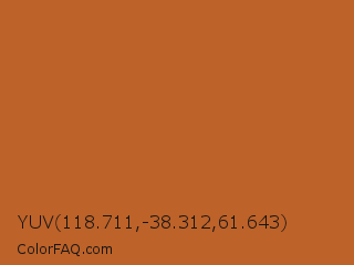 YUV 118.711,-38.312,61.643 Color is a normal orange color and the nearest color is Ruddy Brown #bb6528. Hex code #bd6229 and RGB value is rgb(189,98,41). In RGB color space, this color is composed of 74% red, 38% green, 16% blue, In CMYK color space, this color is composed of 0% cyan, 48% magenta, 78% yellow , 26% black , In HSL color space, this color has a hue angle of 23° , 64% saturation and 45% lightness.