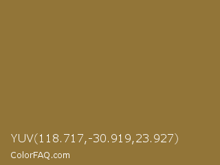 YUV 118.717,-30.919,23.927 Color is a normal orange color and the nearest color is Metallic Sunburst #9c7c38. Hex code #927538 and RGB value is rgb(146,117,56). In RGB color space, this color is composed of 57% red, 46% green, 22% blue, In CMYK color space, this color is composed of 0% cyan, 20% magenta, 62% yellow , 43% black , In HSL color space, this color has a hue angle of 41° , 45% saturation and 40% lightness.