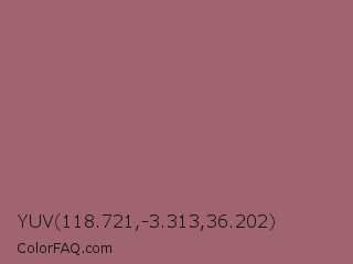 YUV 118.721,-3.313,36.202 Color is a normal red color and the nearest color is Rose Dust #9e5e6f. Hex code #a06370 and RGB value is rgb(160,99,112). In RGB color space, this color is composed of 63% red, 39% green, 44% blue, In CMYK color space, this color is composed of 0% cyan, 38% magenta, 30% yellow , 37% black , In HSL color space, this color has a hue angle of 347° , 24% saturation and 51% lightness.