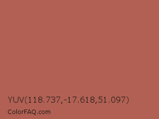 YUV 118.737,-17.618,51.097 Color is a normal red color and the nearest color is Matrix #b05d54. Hex code #b16053 and RGB value is rgb(177,96,83). In RGB color space, this color is composed of 69% red, 38% green, 33% blue, In CMYK color space, this color is composed of 0% cyan, 46% magenta, 53% yellow , 31% black , In HSL color space, this color has a hue angle of 8° , 38% saturation and 51% lightness.
