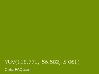 YUV 118.771,-56.582,-5.061 Color is a dark lime color and the nearest color is Limeade #6f9d02. Hex code #719004 and RGB value is rgb(113,144,4). In RGB color space, this color is composed of 44% red, 56% green, 2% blue, In CMYK color space, this color is composed of 22% cyan, 0% magenta, 97% yellow , 44% black , In HSL color space, this color has a hue angle of 73° , 95% saturation and 29% lightness.