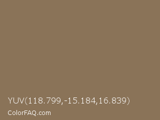 YUV 118.799,-15.184,16.839 Color is a normal orange color and the nearest color is Shadow #8a795d. Hex code #8a7358 and RGB value is rgb(138,115,88). In RGB color space, this color is composed of 54% red, 45% green, 35% blue, In CMYK color space, this color is composed of 0% cyan, 17% magenta, 36% yellow , 46% black , In HSL color space, this color has a hue angle of 32° , 22% saturation and 44% lightness.