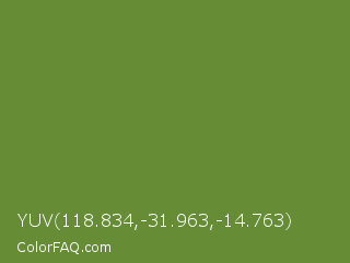 YUV 118.834,-31.963,-14.763 Color is a normal green color and the nearest color is Maximum Green #5e8c31. Hex code #668c36 and RGB value is rgb(102,140,54). In RGB color space, this color is composed of 40% red, 55% green, 21% blue, In CMYK color space, this color is composed of 27% cyan, 0% magenta, 61% yellow , 45% black , In HSL color space, this color has a hue angle of 87° , 44% saturation and 38% lightness.