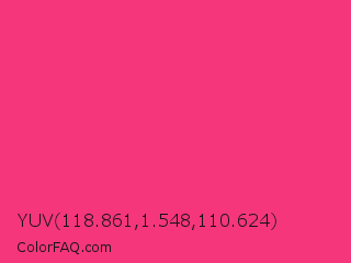 YUV 118.861,1.548,110.624 Color is a normal rose color and the nearest color is Cerise Pink #ec3b83. Hex code #f5367a and RGB value is rgb(245,54,122). In RGB color space, this color is composed of 96% red, 21% green, 48% blue, In CMYK color space, this color is composed of 0% cyan, 78% magenta, 50% yellow , 4% black , In HSL color space, this color has a hue angle of 339° , 91% saturation and 59% lightness.