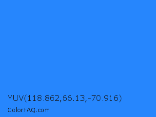 YUV 118.862,66.13,-70.916 Color is a normal blue color and the nearest color is Dodger Blue #1e90ff. Hex code #2686fd and RGB value is rgb(38,134,253). In RGB color space, this color is composed of 15% red, 53% green, 99% blue, In CMYK color space, this color is composed of 85% cyan, 47% magenta, 0% yellow , 1% black , In HSL color space, this color has a hue angle of 213° , 98% saturation and 57% lightness.