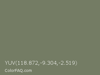 YUV 118.872,-9.304,-2.519 Color is a normal green color and the nearest color is Limed Ash #747d63. Hex code #747c64 and RGB value is rgb(116,124,100). In RGB color space, this color is composed of 45% red, 49% green, 39% blue, In CMYK color space, this color is composed of 6% cyan, 0% magenta, 19% yellow , 51% black , In HSL color space, this color has a hue angle of 80° , 11% saturation and 44% lightness.