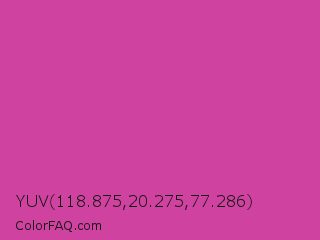 YUV 118.875,20.275,77.286 Color is a normal magenta color and the nearest color is Pink Pantone #d74894. Hex code #cf42a0 and RGB value is rgb(207,66,160). In RGB color space, this color is composed of 81% red, 26% green, 63% blue, In CMYK color space, this color is composed of 0% cyan, 68% magenta, 23% yellow , 19% black , In HSL color space, this color has a hue angle of 320° , 59% saturation and 54% lightness.