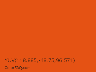 YUV 118.885,-48.75,96.571 Color is a normal orange color and the nearest color is Flame #e25822. Hex code #e55214 and RGB value is rgb(229,82,20). In RGB color space, this color is composed of 90% red, 32% green, 8% blue, In CMYK color space, this color is composed of 0% cyan, 64% magenta, 91% yellow , 10% black , In HSL color space, this color has a hue angle of 18° , 84% saturation and 49% lightness.