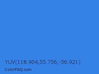 YUV 118.904,55.756,-56.921 Color is a normal blue color and the nearest color is Bleu De France #318ce7. Hex code #3682e8 and RGB value is rgb(54,130,232). In RGB color space, this color is composed of 21% red, 51% green, 91% blue, In CMYK color space, this color is composed of 77% cyan, 44% magenta, 0% yellow , 9% black , In HSL color space, this color has a hue angle of 214° , 79% saturation and 56% lightness.