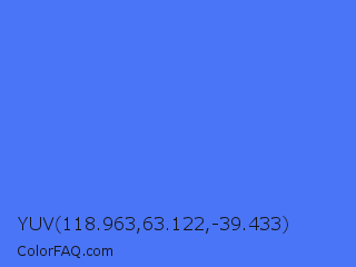 YUV 118.963,63.122,-39.433 Color is a light blue color and the nearest color is Ultramarine Blue #4166f5. Hex code #4a75f7 and RGB value is rgb(74,117,247). In RGB color space, this color is composed of 29% red, 46% green, 97% blue, In CMYK color space, this color is composed of 70% cyan, 53% magenta, 0% yellow , 3% black , In HSL color space, this color has a hue angle of 225° , 92% saturation and 63% lightness.