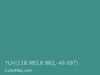 YUV 118.983,8.882,-49.097 Color is a normal cyan color and the nearest color is Lochinvar #2c8c84. Hex code #3f9089 and RGB value is rgb(63,144,137). In RGB color space, this color is composed of 25% red, 56% green, 54% blue, In CMYK color space, this color is composed of 56% cyan, 0% magenta, 5% yellow , 44% black , In HSL color space, this color has a hue angle of 175° , 39% saturation and 41% lightness.