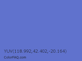 YUV 118.992,42.402,-20.164 Color is a normal blue color and the nearest color is Indigo #4f69c6. Hex code #6072cd and RGB value is rgb(96,114,205). In RGB color space, this color is composed of 38% red, 45% green, 80% blue, In CMYK color space, this color is composed of 53% cyan, 44% magenta, 0% yellow , 20% black , In HSL color space, this color has a hue angle of 230° , 52% saturation and 59% lightness.