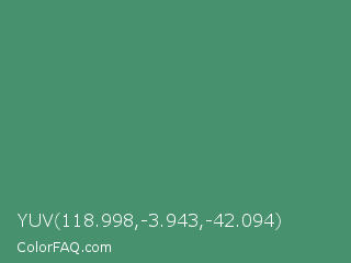 YUV 118.998,-3.943,-42.094 Color is a normal green color and the nearest color is Viridian #40826d. Hex code #47916f and RGB value is rgb(71,145,111). In RGB color space, this color is composed of 28% red, 57% green, 44% blue, In CMYK color space, this color is composed of 51% cyan, 0% magenta, 23% yellow , 43% black , In HSL color space, this color has a hue angle of 152° , 34% saturation and 42% lightness.